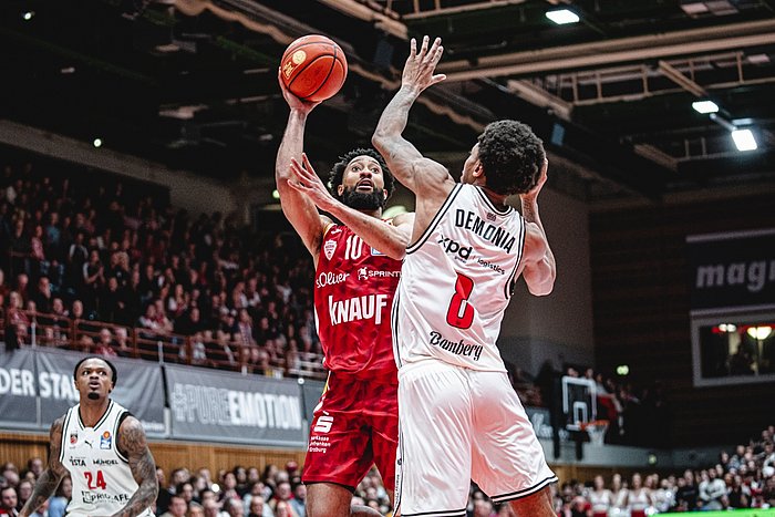 Nach dem ersten Viertel lagen die Unterfranken mit 22:19 vorne und trafen im zweiten Abschnitt drei weitere Drei-Punkte-Würfe (8 von 20 in der ersten Halbzeit - 40 Prozent). Das Problem in der Offensive war vor der Pause die fehlende Durchschlagskraft in der Zone - nur 4 von 14 Versuchen aus dem Zweierbereich waren erfolgreich, weil EJ Onu (3 Blocks in der ersten Halbzeit) und seine Bamberger Kollegen in Brettnähe physisch und erfolgreich verteidigten.